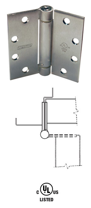 MPS60 – Performance tested by UL to exceed ANSI A156.17 Standard for Grade 1 Single Acting Spring Hinges. Base material available in powder prime coat or dull chrome finish. Recommended for standard weight hinge applications requiring self-closing control, such as apartments, hotels, motels, dormitories, office buildings, etc. MacPro by McKINNEY templated hinges are made to conform to ANSI/BHMA 156.1, 156.7, 156.17 Features: Ease of Adjustment, Tamper Resistant, Durable & Reliable Available Finishes: P (powder prime), and US26D Available Size: 4-1/2 x 4-1/2 (114.3mm x 114.3mm), Gauge=.134 Available Options: