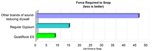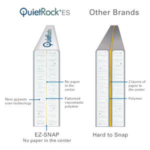 QuietRock ES sound-reducing drywall with EZ-SNAP™ Technology is 4X easier to score and snap than other acoustical drywalls and the only noise reducing drywall on the market without paper in the middle. QuietRock ES' patent pending approach incorporates new gypsum core technology which offers greater strength, enhanced fire resistance, and easier score and snap than even standard gypsum board.