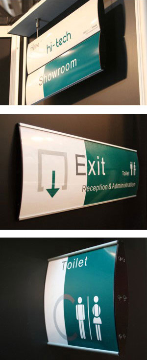 Contemporary convex sign system. DescriptionClearPath's Hi-Tech™ wayfinding frame system is a dynamic convex modular sign system with a popular, contemporary look. The Hi-Tech convex extrusions can be used in a multitude of configurations, including wall, suspension, flag and totem signage. Hi-Tech offers designer, architects and contractors a convex interior and exterior sign system that can be uses in a wide range of applications. Uses and ApplicationsThe Hi-Tech family of products is ideal for applications where the customer is looking for a contemporary convex sign system. Hi-Techsign inserts can be easily replaced without removing the sign, making the product perfect for office buildings, medical offices, hotels or anywhere room assignments and usage may change. Features and BenefitsHi-Tech sign frames feature square, round or ellipse synthetic end caps and aluminum double-sided end caps, which give designers and architects the ability to create a multitude of complimentary looks with one sign system. Hi-Tech also features six standard convex profile heights and five variable insert profiles in widths up to 217mm, which gives designers and architects complete flexibility when designing their signage system. ClearPath standard insert profiles can be used throughout the HiTech, Alliance, Jazz, DeSign, and Multifunctional Totem systems. This gives sign makers, architects and environmental graphic designers the ability to combine components across product lines. ClearPath's wayfinding frame system is the perfect modular system with a range of combined looks and styles available to meet the demanding needs of custom way finding systems. Design and PerformanceHi-Tech products are manufactured to work flawlessly in both interior and exterior applications. All Hi-Tech panels are designed to work both horizontally and vertically. Standard convex profiles are available in the following heights (all available up to 217mm wide):