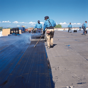 Conventional bituminous built-up roofing (BUR) membranes have been used for over 100 years and continue to represent a major portion of today’s roofing. The membrane is field fabricated and consists of layers of a waterproofing bitumen alternating with plies of reinforcing felts with an appropriate protective surfacing. The reliability of BUR is enhanced by the redundancy of the plied-in layers of roofing felts. JM manufactures a complete line of fiber glass felts including ply, base and mineral surfaced cap sheets. Ply felts are coated with a high grade asphalt. Two types are available: GlasPly™ Premier and GlasPly IV. Base felts are coated with a filled asphalt and are intended for use as a base sheet in nailed specifications. Our standard base felt is called PermaPly 28™ . Another version, which incorporates a coating of rubber-modified asphalt, is called GlasBase Plus™ . And GlasKap™, a glass mat coated with filled asphalt and surfaced with mineral granules for use as a cap sheet in BUR systems, is also available. Another product, Ventsulation™ Felt, is primarily used as a venting base sheet for applying a new built-up roof over an existing bituminous membrane that is no longer serviceable, or over lightweight insulating concrete substrates. For flashing, a uniquely reinforced fiber glass felt known as GlasTite™ Flexible is available. Of course, various cements, coatings and surfacings are available to make for a complete, single-source system. JM approved asphalt is required for hot applied built-up roofing system applications. Roofing asphalts are available in four types (specified by softening point). The slope of the roof, in conjunction with the climatic constraints, determines the type to be used. The success or failure of a roofing system depends on the use of the proper type of asphalt as called for in the roofing specification.