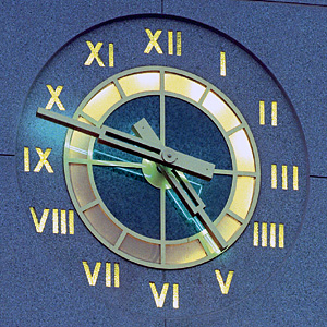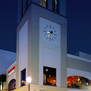 Neo-Classical, roman numeral dial backlit in pre-cast concrete panel.