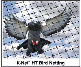 Use K-Net HT for all bird exclusion projects including architectural, aquacultural and agricultural applications. The 3/4 square mesh keeps out all but the smallest of pest birds. From the largest structural installations to simple enclosures over gardens, K-Net HT provides the strongest and longest lasting protection for the price.