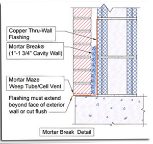 Advanced Mortar Break® Product Classification: 04082 Sweet's Catalog Code: 04082/Adv Buyline: 0154 Advanced Mortar Break® Deflection System Mortar Break® The complete Mortar Break® system is a popular cost competitive way to insure proper cavity wall drainage. The Mortar Break® system has been tested and exceeds industry standards. Description: Mortar Break® is a mortar deflection device used in conjunction with standard masonry cavity walls with a 1" to 1-3/4" wide cavity. Polymer Type: Nylon 6 containing 2% by weight carbon black for ultraviolet protection. Note: Any mortar deflection device is only as good as the flashing with which it is installed. The Brick Institute of America states in its technical note #21: "It is suggested that only superior materials be selected for flashing, as its replacement in the event of failure will be exceedingly expensive." Basic Use For use at all flashing locations, such as cavity, composite, single wythe and veneer applications (see detail). The polymer core geomatrix design allows moisture to seep down through any mortar droppings and weep out of the wall through the weep holes. Mortar Break® used with properly installed flashing and weep holes along with good mortar applying techniques, will ensure the performance of a well-designed masonry wall.