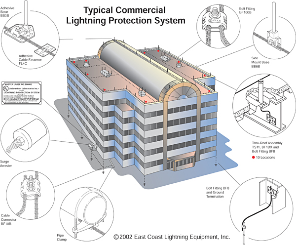 Lightning protection system components are constructed from highly conductive copper and aluminum alloys. A lightning protection system is intended to last the life of the structure it protects and typically only requires maintenance in the event that the protected building is changed structurally. Typical Commercial Lightning Protection System. There's Nothing Magical About Good Lightning Protection. A lightning protection system performs a simple task. It provides a specified path on which lightning can travel. When a building is equipped with a lightning protection system the destructive power of the lightning strike is carried safely into the ground, leaving the structure, its contents and its occupants unharmed. A lightning protection system does not attract, repel or prevent a lightning strike. Modern lightning protection systems are installed to blend with the style and materials of a structure, making the system practically undetectable from the ground.