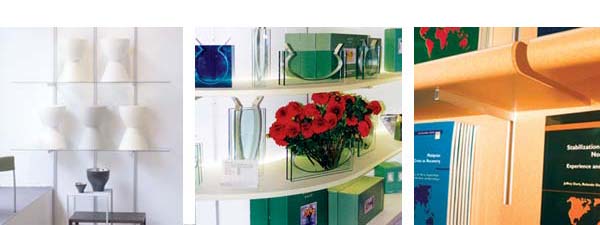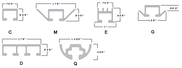 C-STANDARD Our most basic extruded aluminum wall standard used for either surface or recess mounted applications. M-STANDARD A decorative profile used for surface mounted applications. The 1 3/4" wide profile and flared sides make a dramatic vertical statement. E-STANDARD An extruded aluminum wall standard designed to be recess mounted between 5/8" drywall panels. The front flanges cover the rough-cut edge of the drywall. G-STANDARD Designed to be mounted between 1/4" glass mirror or wood panels. The front flanges cover the panel edge. D-STANDARD Two channels allow for independent adjustment of shelves in both continuous and staggered configurations. Q-STANDARD A decorative profile designed for heavy-duty application. With Rakks Style Support Brackets (BR & TB) load capacities are increased by 25%. Supplied with 2" screws and twin mounting holes at each end. additional information available at rakks.com |