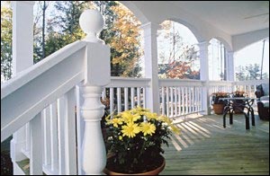 HVAC systems of many houses built over crawlspaces deliver conditioned air through ducts located in the crawl-spaces. Whenever possible, ductwork should be located within the floor cavity (e.g. between joists, or between or through trusses or I-joists). When that is not possible, adequate clearance between the bottom of the ductwork and the ground should be provided to maintain proper ventilation. All ductwork should be meticulously sealed to avoid unnecessary energy losses from air leaks. Penetrations for plumbing, wiring and air ducts should also be sealed to minimize air exchange between the crawlspace and the living space. Ductwork should also be insulated to prevent condensation on the ducts. In addition, insulation should be carefully installed to the underside of the floor within the floor cavity. Never vent moisture or heat-producing sources (e.g. clothes dryers, kitchen or bath vents) into the crawlspace. Crawlspace Ventilation. Building code requirements for ventilation openings through foundation walls are intended to reduce moisture levels in the crawlspace. Section 1203.3 of the 2003 International Building Code sets forth the underfloor ventilation openings and cross ventilation requirements for enclosed crawlspaces, such as within stem wall foundations. Open pier-and beam foundations, commonly used with raised floor systems, already create a fully vented crawlspace. Generally, building codes mandate that the minimum net area of ventilation openings required are not less than one square foot for each 150 square feet of crawlspace area. When an approved vapor retarder covers the underfloor ground, the minimum vent opening area can be decreased to one square foot for every 1500 square feet of crawlspace area. Vent openings are placed to provide cross ventilation of the underfloor space. These vent openings should be screened to inhibit pest entry into the crawlspace. They also should not allow rain water or runoff to enter into the crawlspace. Conditioned and Unvented Crawlspaces. Conditioned and unvented crawlspaces are only recommended when mechanical systems distribute conditioned air within the underfloor area. A conditioned and unvented crawlspace typically has insulated walls and can be thought of as a short basement. This type of crawlspace is designed to communicate with the living space. It should be dry, temperate, and have good air quality. Conditioned air spaces should not be ventilated with outdoor air. Conditioned and unvented crawlspace systems should have a continuous ground cover sealed to insulated perimeter walls and any supporting piers. Care should be taken with all air-sealing construction details. This is necessary to minimize the unintentional introduction of unconditioned air, reducing the possibility of condensation on cold surfaces. In addition, extra care should be taken to prevent moisture from being trapped in the crawlspace. Any moisture that does get into the crawlspace should be remediated immediately. Ground Cover (Vapor/Gas Retarder). Draining storm water away from the foundation, preventing standing water beneath the crawlspace, and making provisions to remove excess moisture entering the crawlspace, are all-important elements needed to provide a dry, trouble-free raised floor system. Control of ground moisture is also essential. One of the best ways to control this moisture is through the use of a ground-applied vapor retarder. Exposed soil in crawlspaces and under porches and decks should be covered with an approved vapor retarder. A ground cover that retards transmission of water vapor from the soil into the crawlspace provides an effective way to prevent moisture and humidity problems. It should have a permeance of no more than 1.0 perm, complying with ASTM E1745, to resist alkali and other chemicals that can be contained in soils. It should also be rugged enough to withstand foot and knee traffic. The most commonly used ground cover material is a 6-mil (0.006 inch) polyethylene. Before installation of the ground cover, the crawlspace floor should be smooth and free from sharp rocks and construction litter. Exact installation details will vary depending on the primary function of the ground cover (i.e. moisture control or radon gas control). For any crawlspace system, it is important to avoid standing water on top of the ground cover. For unconditioned and vented crawlspaces, the edges of the cover should be overlapped 4" to 6". The cover does not need to extend up the face of the foundation wall, and no sealing is required. If the control of radon or other soil gases is not of primary importance, the ground cover may be cut in several low spots to provide drainage if needed. Conditioned and unvented crawlspaces should have a continuous ground cover over all crawlspace soil. The ground cover should be sealed at the joints, as well as sealed to the perimeter wall and any piers. A thin layer of concrete added over the ground cover provides a better seal and further inhibits the entry of rodents. Inspection and Maintenance As with any structure, long-term performance of a raised floor system requires regular building inspections and maintenance. Building codes require access to all under-floor spaces, with a minimum opening of 18" by 24" through a floor, or 16" by 24" through a perimeter wall. The crawlspace should be inspected periodically to check for excessive moisture conditions from leaky plumbing, HVAC ducts, or standing water. The crawlspace should also be inspected periodically for the presence of damaging pests. Needed corrective actions or repairs should be made promptly to avoid problems related to moisture or pests. For additional information on moisture control, as well as a variety of other important design/build considerations for raised floor systems, refer to the Raised Floor Design and Construction Guide available at www.southernpine.com. Guide to Porch Flooring & Construction The porch has withstood the test of time as an
