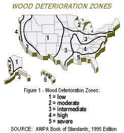 What is Pressure-Treated Lumber? When most wood is exposed to the elements, excessive moisture, or contact with the ground, it will decompose. That is because four conditions are required for decay and insect attack to occur: moisture, a favorable temperature (approximately 50 to 90 degrees Fahrenheit), oxygen, and a source of food (wood fiber). If any of these conditions is removed, infestation and decomposition will not occur. Southern Pine has long been a preferred species when pressure treatment with preservatives is required, because of its ease of treatability. The unique cellular structure of Southern Pine permits deep, uniform penetration of preservative chemicals, rendering the wood useless as a food source for fungi, termites and micro-organisms. Some 85% of all pressure-treated wood is Southern Pine. Why design and build with pressure-treated wood? Figure 1 indicates, by region, the level of wood deterioration throughout the United Stats. As shown, deterioration zones ranging from moderate to severe cover most of the country. To find a source of supply for pressure-treated Southern Pine products, use the Product Locator at www.southernpine.com. Types of Wood Preservatives Several waterborne preservatives are commonly used including Chromated Copper Arsenate (CCA), Alkaline Copper Quat (ACQ), Copper Azole (CA) and Sodium Borate (SBX). As of December 31, 2003 CCA has been withdrawn for most residential consumer-use treated lumber applications. CCA treatment will continue to be allowed for certain industrial, agricultural, foundation, and marine applications. For a list of products that may continue to be treated with CCA, go to www.southernpine.com. Consumer Demand Drives Alternative Wood Preservatives Changing market perceptions and public interest in alternative preservatives has led to changes in the treated wood products offered to consumers at retail. Today, the consumer has more choices when it comes to wood preservatives. In consultation with the Environmental Protection Agency, manufacturers have made a transition to alternative wood preservatives for the residential and outdoor market. Leading preservative manufacturers, Arch Wood Protection, Inc., Chemical Specialties, Inc. and Osmose, Inc. have amended their respective EPA registrations for Chromated Copper Arsenate (CCA), limiting the use of CCA to approved industrial and commercial applications. Regardless of the preservative used, builders and homeowners will find Southern Pine is the species of choice when pressure treated lumber is specified. Southern Pine is preferred because its unique cellular structure permits deep, uniform penetration of preservatives. To learn more about these alternative wood preservatives, go to www.southernpine.com. CCA Information Pressure-treated lumber preserved with CCA (chromated copper arsenate) has a near 70-year track record of safe, effective use. Scientific studies have shown that CCA-treated wood poses no significant measurable risk to humans, animals, plant or marine life when used as intended. The treating industry stands behind the proven safety of CCA-treated products. An important wood preservative in the United States, CCA will continued to be used for EPA-approved industrial and commercial applications. The EPA does not believe there is any reason to remove or replace existing CCA-treated structures, including decks or playground equipment. Furthermore, EPA is not recommending that existing structures or surrounding soil be removed or replaced. To learn more, go to www.southernpine.com. Building Code Requirements Generally, building codes require pressure-treated or naturally durable wood for the following applications: