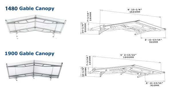 The LightLine® Gable Canopy is a contemporary spin on the beautiful pitched roof design. The kits come in two sizes: 1480mm (58-in) with 2 stainless steel support brackets and 1900mm (75-in) with 3 support brackets. A rubber gasket on the edge of the acrylic pane helps to seal the canopy to the wall surface and direct rain away from the wall and into integrated side gutters. The 4mm (3/16”) thick, UV resistant, acrylic pane is secured with the special Click-Lock attachment feature creating a strong, durable, weather-tight structure. Available in either clear or frosted finishes.