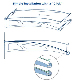 The patented Click-Lock system eliminates need to drill holes in acrylic panel and makes installation of panel into the stainless frame a snap. Simply insert the acrylic panel into the frame, lower the support arm and snap the Click-Lock ends together. Attach caps to the ends of the rain gutters to secure and lock the arms and panel in position.