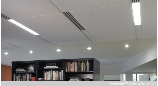 With the new TechZone™ ceiling system, you can easily achieve a monolithic, uncluttered ceiling visual using standard components and organize the look of the space you've designed. Six-inch wide technical "zones" organize services, including lighting, diffusers and sprinklers in a system that' pre-qualified for fit and finish. It's affordable, hassle-free, reliable and easy to specify and install compared with other alternatives. Say goodbye to clutter! Take control with TechZone. TechZone is an organized system using standard components:
