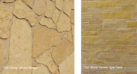 Thin Stone Veneer Mosaic Asymmetrically shaped, 1” thick and 6”-12” in diameter; Thin Stone Veneer Mosaic provides a classic timeless look to any project. Thin Stone Veneer Split Face Mechanically split on the front only; Thin Stone Veneer Split Face has a natural