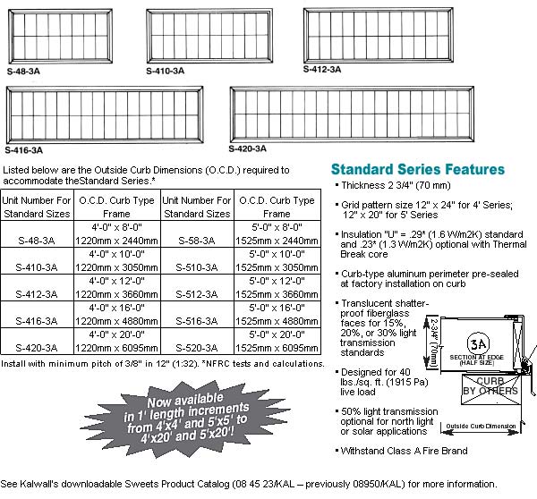 - Standard flat skylights from 2' x 2' to 5' x 20' ready for curb mounting.