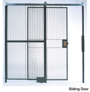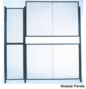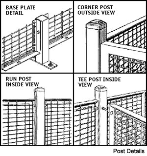 MATERIALS PANELS - Shall be 10 gauge steel wire crimped and woven in to 2” x 1” opening rectangular mesh, securely welded into a frame of 1-1/4” x 1-1/4” x 1/8” steel angle factory punched with 7/8” x 7/16” slotted holes to accept 3/8” mounting hardware. Panels four to six feet wide shall have one 1/4” x 3/4” flat stiffener, wider panels receive two 1/4” x 3/4” stiffeners. All panels shall be fastened to posts with 3/8” x 3” plated bolts and nuts. DOORS - Hinged shall be constructed of the same materials as the panels with two 1/4” x 3/4” horizontal stiffeners across the width, and two diagonal 1/4” x 3/4” stiffeners from center to the corner. Hinged doors shall be equipped with padlock lugs (cylinder lock optional), three 4” x 4” spun pin hinges, and pick plate/slam bar assembly. DOORS - Sliding shall be constructed of the same materials as the panels with two 1/4” x 3/4” horizontal stiffeners across the width, and two vertical 1/4” x 3/4” stiffeners from center to top or bottom. Sliding doors shall be equipped with two 4 wheel trolley trucks, 1-7/8” x 2-3/8” door track, pad lock lugs (cylinder lock optional), and door keeper assembly. POSTS - Shall be made of 2” x 2” x 14 gauge steel tubing. Base plates of 2” x 7” x 1/4” steel flat with two 7/16” round holes for anchoring, shall be welded to each tube. Posts are factory drilled with 1/2” holes to accept hardware for mounting panels. HARDWARE - Shall be 3/8” standard thread grade two plated nuts and bolts. Floor anchors are 3/8” wedge type-provided. FINISH - Non-plated parts receive one coat of gray acrylic enamel. Touch up paint included with each shipment. |