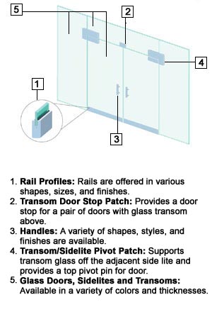 All-Glass Entrance Systems Oldcastle BuildingEnvelope™ entrance systems can employ swinging or sliding doors, as well as stacking or bifold panels. Many variations are available with Oldcastle BuildingEnvelope™ tempered glass entry doors. They can be used with corner patches only, with continuous rails only, or in combinations of the two. The sketches shown here illustrate some of the many possibilities. Where should I use them?