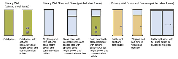 Privacy Wall Specifications Privacy Wall, manufactured by Steelcase Inc., is a moveable wall panel suitable for use with a raised or slab floor and a suspended ceiling. It consists of unitized wall panels, doors, frames, connectors, and power options. Privacy Wall is available in many standard widths (up to 12-feet), heights (up to 10-feet), and a variety of glass options. If needed, Privacy Wall solid panels can also be cut to size in the field. Aesthetic choices include steel (painted), vinyl, fabric, glass, glass with muntins, and wood veneer. Wall units are 2-3/8-inches thick, have 2 1/2-inches of vertical adjustment and integral slotting on 1-inch centers for mounting worksurfaces and storage components. Units also have an integral screw leveling capability that is concealed behind a removable steel base. Solid wall units weigh no more than 4.6-pounds per square foot. The system is installed to the underside of a suspended ceiling without the use of destructive fasteners. Wall unit intersections are non-progressive, connected with a painted feature strip holding the units continuously together without clips. The wall system is installed on top of the finished floor, raised flooring, or carpeted flooring without the use of floor fasteners. To minimize inventory, pivot doors and frames are designed to be non-handed. They can be either right-handed or left-handed swinging and can be changed between the two. Other options include traditional butt hinged doors and self-supporting sliding doors. Specialty Glass Our strategic alliance with Bendheim, the largest provider of specialty glass
